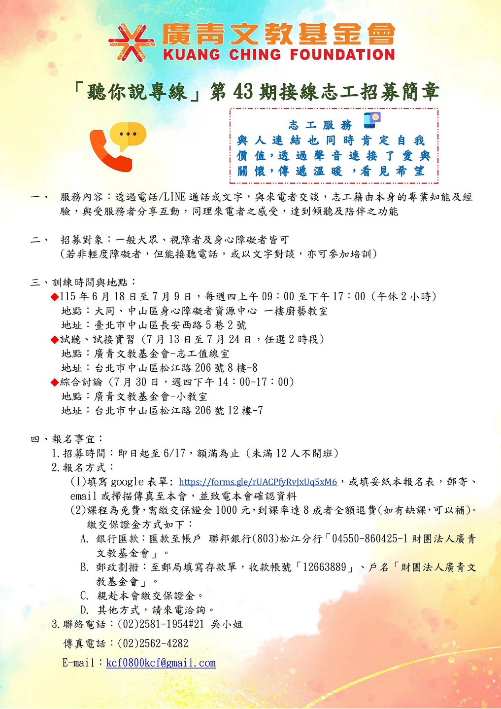 二、招募對象:一般大眾、視障者及身心障礙者皆可(若非輕度障礙者,但能接聽電話,或以文字對談,亦可參加培訓)